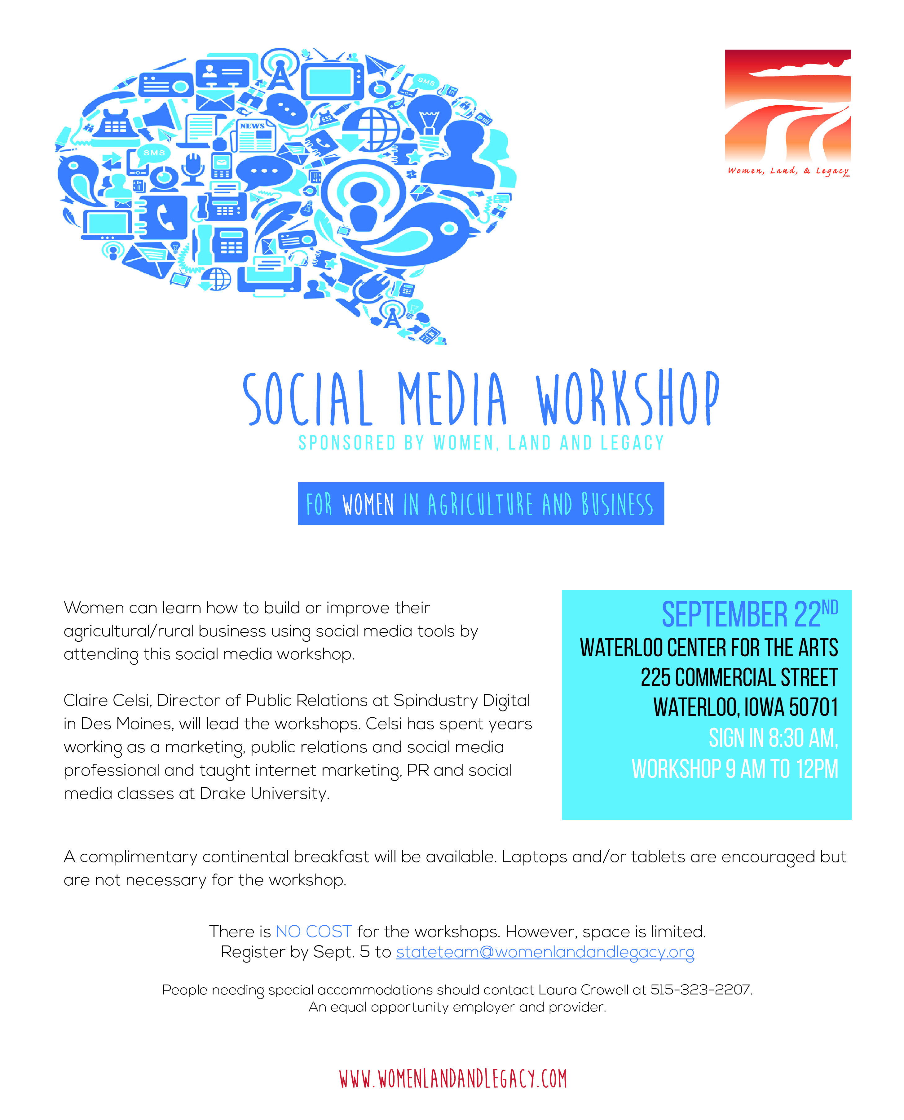 August 6, 2014 – Des Moines, Iowa Women, Land and Legacy will host two social media workshops for Iowa women involved in agriculture and/or rural businesses. Women can learn how to build or improve their business using social media tools by attending one of two morning workshops on Sept. 12 in Des Moines or Sept. 22 in Waterloo.